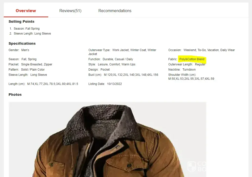 The item we received is an awful light brown/yellow sheen coat, that is very light reflective and resembles satin (100% polyester).