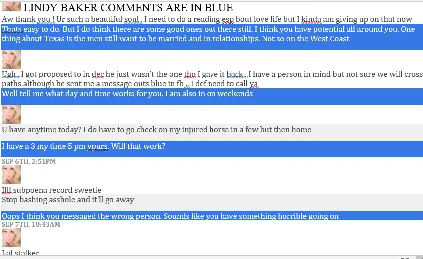 Be very careful w lindy as she will post your personal and intimate details you tell her in your sessions about your marriage problems etc.. On your facebook page for everyone to see. No discretion allowed with this one. Be aware of what you share with her during your session. If you need proof just email me.. Also know that I have known lindy for years as life coach/medium. Gave her furniture when she had none and this is how she does you? All because a difference of opinions in politics? Saying i'm crazy as she starts posting crazy posts is definitely serious cause for concern. Scary, to give someone such intimate details to have them post so publicly for 5000 people on my fb page to see. These people only learned of these personal detail due to her posting.