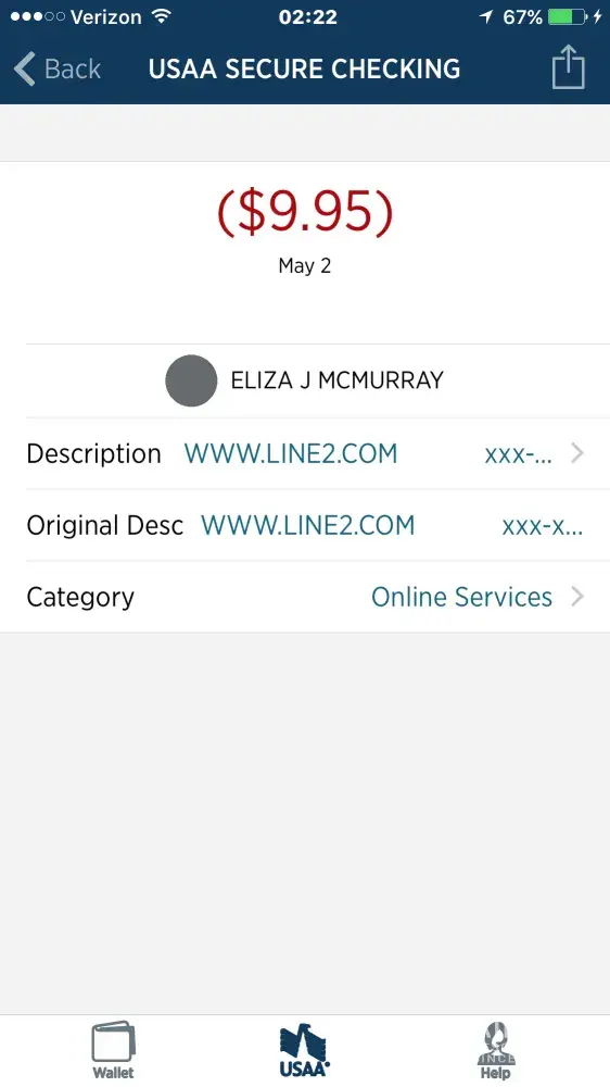 You've been charging BOTH of my USAA accounts; my credit card which FINALLY stopped after changing account numbers not once but twice. My checking account however, this sleazy Line2.com has mastered the art of making cancellation an impossibility. Over 2 1/2 years now every month, without fail, this Line2.com has charged my checking account 9.95. All the debit card changes in the world have not arrested them! Im furious and calculating them to owe me approx. $280!