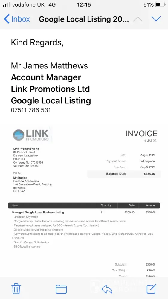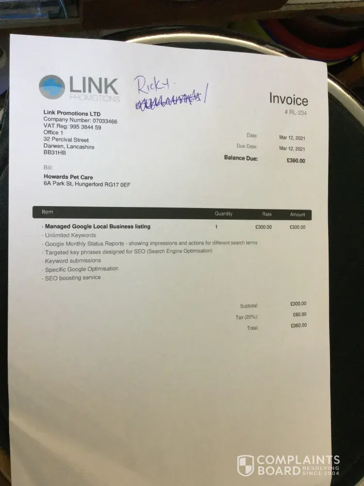 Scammers. This company called me today on our business land Line and explained that they look after & manage my business Listing On behalf of Google. His name was apparently James Matthews, very convincing normal sounding English man. After a few minutes checking with me that all our details Where correct on the Google listing, he then said if I would like to renew The listing for another year It would cost £360. I said I did not remember having to pay this last year and he said yes it was the same deal as last year. I ask him to send details and an Invoice by email and I would look into it. He said he would call back later today once I had checked invoice for payment over the phone. That's wheN I realised because to Invoice heading was Link Promotions Ltd from Lancashire,, Never ever heard of them before.