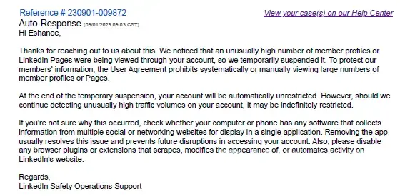 I have been a loyal user of LinkedIn for over a decade and have never had any issues until recently. My account was permanently deleted due to too many profile views, which I find unfair as social selling is a crucial part of my job. I even received authorization from my manager for SalesNav in my new role to prevent this from happening. However, LinkedIn claimed that I used automation software, which is not true.