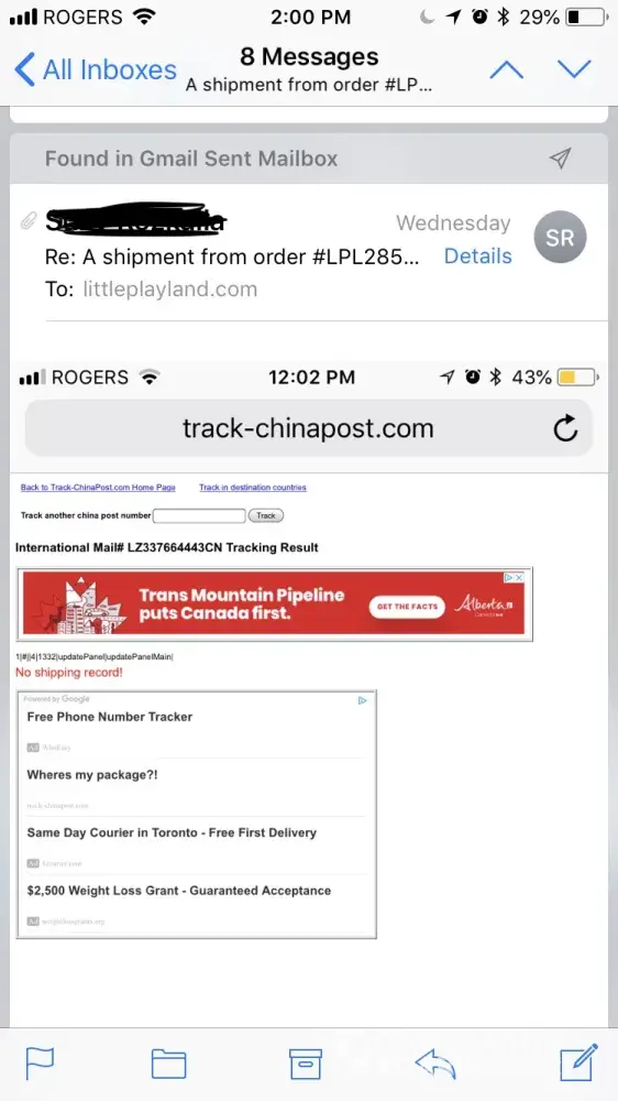 I purchased this product but have received nothing from them. Emailed them and requested tracking number and the date product was shipped. Have checked tracking number and according to China Post there is no record for this number. Littleplayland said that it takes a few day for the update to come through, that was last week, I have checked today and it still says "No Record of Shippment".
