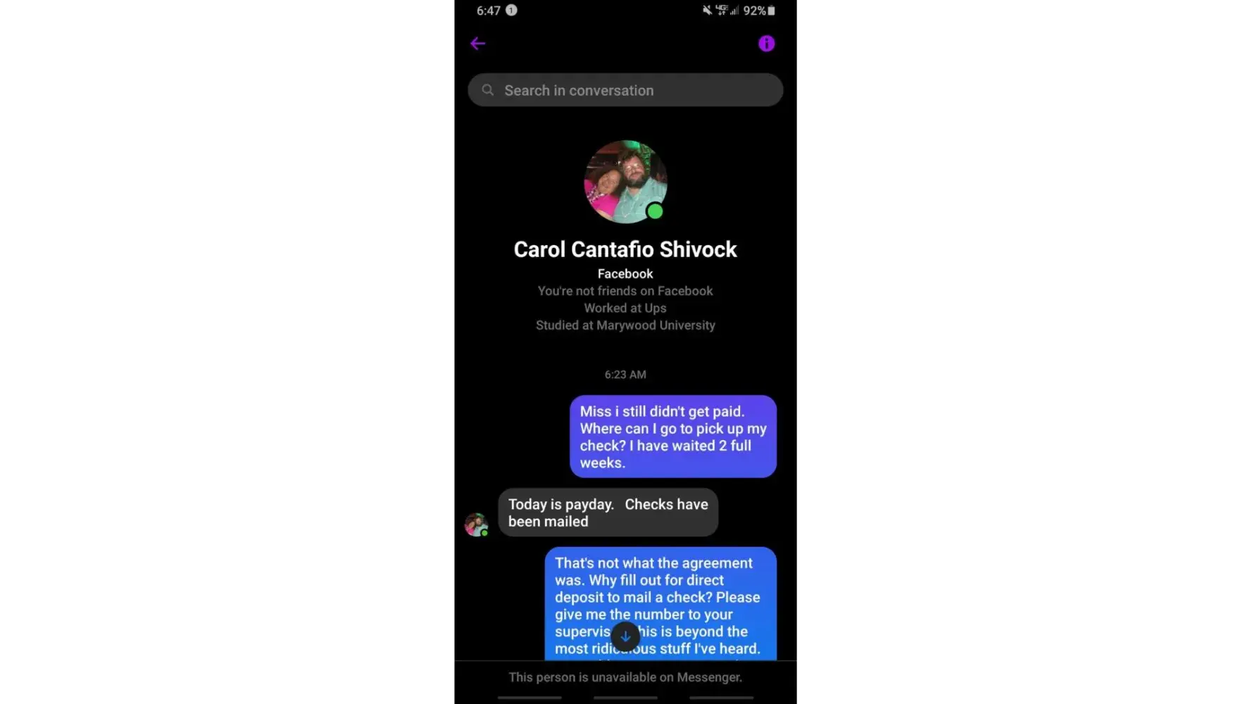 I worked the peach fest in scranton, pa 2023 on July 1st. I have yet to be paid and it's currently the 14th of July. The lady I was told to contact regarding pay was Carol cantafio shivock. First they pit jobs on Craigslist...sketchy. then make you tap into a Facebook group...sketchy and that was my contact source, a Facebook message. Was told they pay every 2 weeks. Still waiting for pay. I was told they mailed put checks after the 2nd week came just to keep me quiet, but I filled out direct deposit and the company is supposedly in texas... how is that possible? I saw and was told nothing of the sort. They made all that money. Had me driving a Ford truck with a wagon transporting peoples luggage for 12 hours and no compensation.