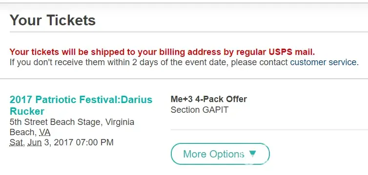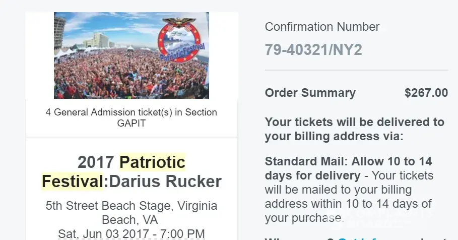 On April 2, 2017 I purchased 4 tickets to see Darius Rucker perform at Virginia Beach’s Patriotic Festival; Darius Rucker was scheduled to perform on June 3rd. Upon completing my transaction, I was notified that my tickets would be shipped to me in 10-14 days.