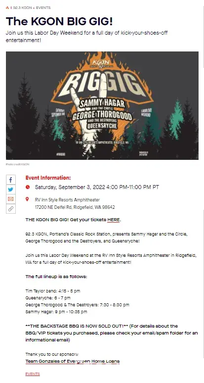 Big gig, sammy hagar, george thorogood, queensryche and glorious sons. September 3, 2022 @ rv innstyle amphitheater.