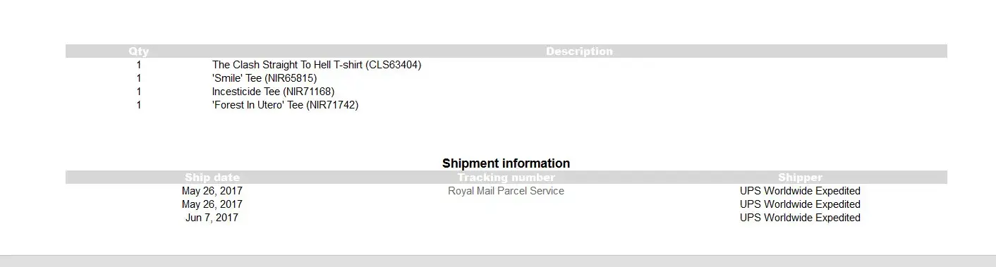 The second package had 3 shirts instead of 4. The invoice in that package stated 3 shirts. However I ordered 4 and when I enter my order number on the website it clearly shows 4 shirts. Also i have been charged for 4 box sets and 4 shirts.