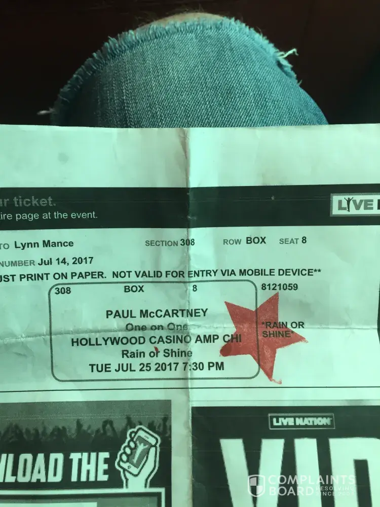 Live Nation completely screwed us over on our tickets to Paul McCartney at Hollywood Casino Amphitheatre Chicago. We bought box seats that had a seat number on them, so as anyone would, we thought we had seats no matter what time we got there. Well that's not the case. As we where walking up the stairs we were told that the seats in the box are "first come first serve" okay that's understandable, but when we got to the box there were not enough seats for our entire group. We didn't even need or ask for all of our seats to be together, there were just not enough seats. We had a group of 5 and there were only 4 available. After speaking with some workers who got their supervisor the supervisor informed us that "bar stools are sold as seats" which is completely unacceptable. If that's how the box works why does my ticket have a seat number on it? Even if it is first come first serve on the seats there should be enough seats for everyone in the box not including bar stools. The girl who was "helping" us told us that "it is the second party ticket distributer that put the seat number on the ticket" when the ticket had Live Nation posted all over it. Then she leaves and says "I'll go get more barstools" she never apologized for the inconvenience, didn't even try to solve the problem. Later as we are still waiting for barstools to be delivered I see her walk by multiple times but never stopped to see if things where okay or to even let us know that barstools are being delivered. It gets to the point where I leave the box as the show is starting to find her, standing next to another manager watching the show with a better view than my entire group who paid for box tickets. When I confronted her and asked what happened and why she never came back to our box she stood there speechless and her coworker Dylan Johnson jumps in and doesn't help the situation at all. He does the same song and dance saying that it's the second party distribution company but ignoring that live nation is posted everywhere on the ticket INCLUDING LIVE NATION COPYRIGHT! I also complained that this girl never came back to our box to talk to us, she basically just bailed on us. He then wanted to argue that "she put in a request for more barstools but we are sold out so there aren't any more..." great. Why didn't she come tell us that? Why was there never an apology? Instead Dylan wanted to argue with me instead of handling the problem. I was furious and left the area. After cooling off for a second I went back out to get names. When I found them I asked for both of their names. Dylan was happy to give me his card like that was going to fix the problem. I asked the girl her name and card but she just gave me a name and couldn't even bother to stop walking or to look me in the eyes while doing it. I'm pretty sure she said her name was Sarah and I'm sure that Dylan knows exactly who she is. Everything about this experience through Live Nation Chicago and Hollywood Casino Amphitheatre, Tinley Park was terrible and we do not plan on returning ever. At no point during the sale of the ticket, while going through the VIP line, or even sitting in the extremely over priced VIP lounge where we told that seats are first come first served. If we had known that there probably wouldn't be a issue but instead the ticket is made to look like everyone in my group was guaranteed a seat and that was not the case. It was not the second party ticket distribution company. Everything on the ticket said Live Nation. Not only was the ticket a complete scam to sell more tickets, but the people working for live nation where completely rude, did not communicate, and where more interested in watching the show (while getting paid to work while ticket holders can't see the stage) it is completely unacceptable and I'm looking for a response back as soon as possible.