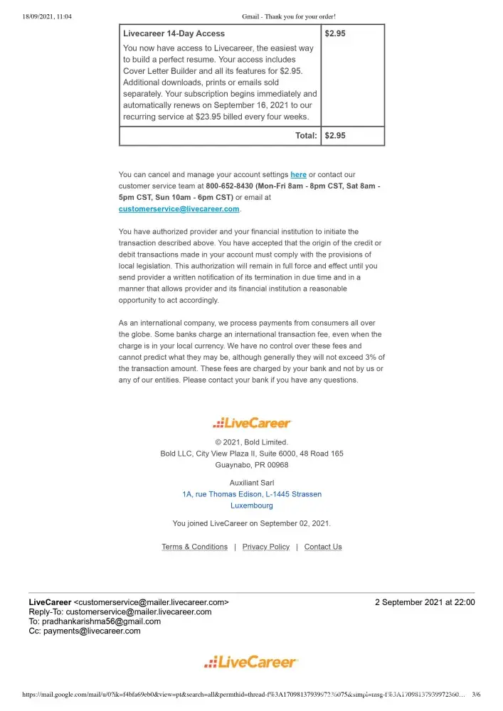 It asks $2.95 to download the resume that I created. I agreed to pay that amount. Then the website started to charge me $24.95 every month from my credit card, and there wasn't any notice on the website telling you would be billed such a big amount monthly. I found it out by checking my credit card bills, after LiveCareer charged me 3 times. The website advertises on Google that the service is FREE. This is credit card fraud. I reported it to my credit card customer service and got 2 transactions cancelled and 1 disputed. And the credit card service would start to investigate it. Also LiveCareer gathered my personal data, I am concerned they would share or sell it to third parties.