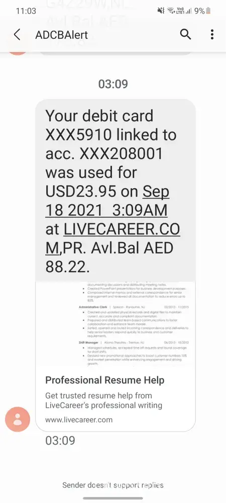 My name is Karishma Pradhan and today morning I received an SMS stating USD 23.95 has been deducted automatically for Account ID:[protected] without my use. On what basis was I unnecessarily charged USD 23? There was no prior mail for the payment. Also, I haven't used live career since 3rd September 2021 then how can they deduct money without informing me? This is highly unprofessional.
