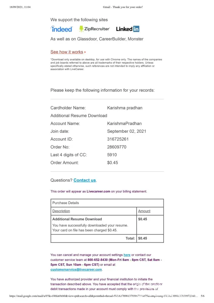 Check this out! Scam! Go to livecareer.com or type in any search "livecareer scam" they take your money! You can't print out your resume without giving a credit card! Then they keep making charges to it! When you contact them they don't refund your money! They get you by avertising on gooogle as a "free"rsume site and after helping you with making a resume you must pay to be able to download or print your resume. That is when they get you and start charging you for £13.5 a month!