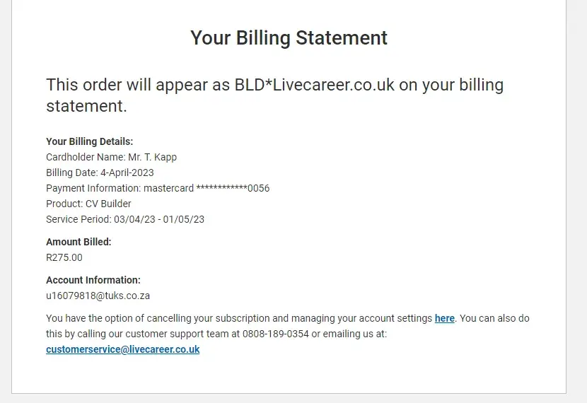 In April I used LiveCareer to create a CV. I created an account and I gave them my information to download the CV I created. In June I checked my credit card accounts and I discovered that LiveCareer charged me already 2 months for a subscription that I had never made! I contacted their customer service via email and they started asking more information on my credit card saying that they couldn’t find any subscription with my email address and account ID. Moreover, they suggested me to cancel my subscription directly from my account and, guess what?, no possibility to cancel is available! This is the 3 month in a row that I pay 24.99 euros for a service that I don’t use and I have never asked!