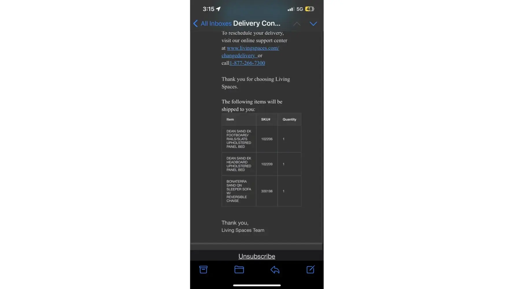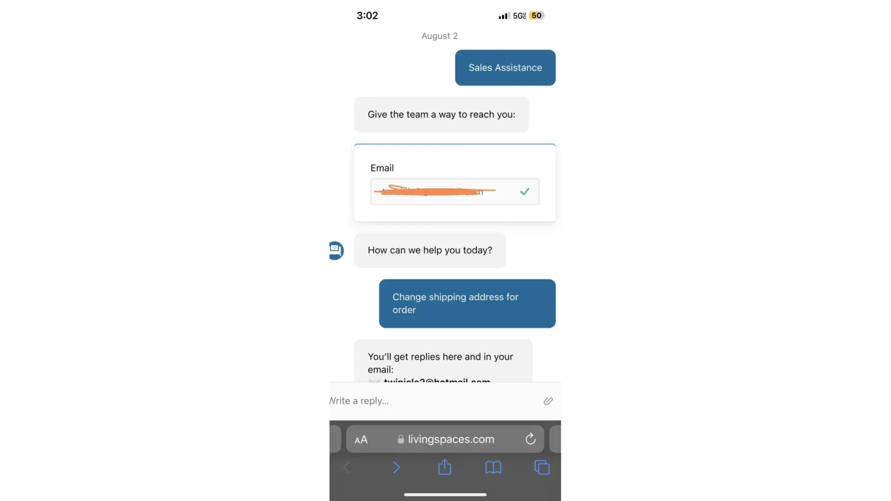When I contacted Living Spaces via their chat on August 2, no one replied so I called on August 3 and they said my delivery window was within 48 hours (August 5th) so they could not change the shipping address without charging me $59.