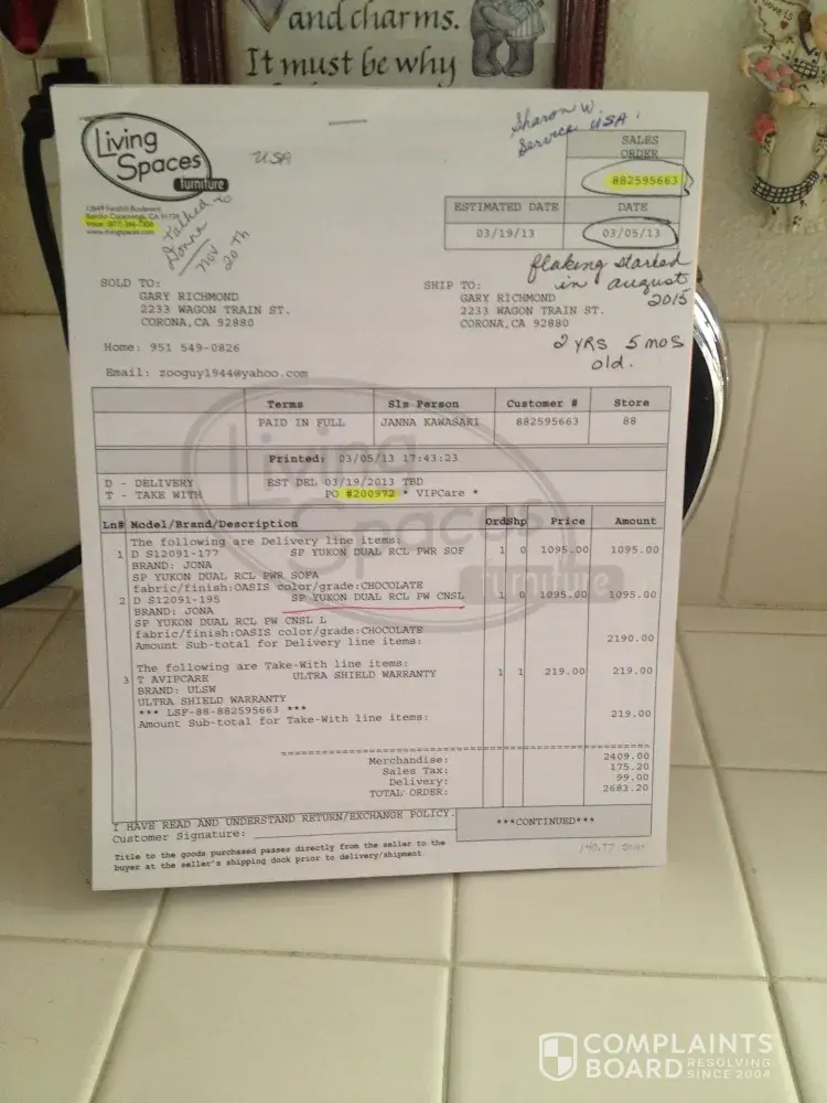 I dont know if this is the right place to complain about a living room set we purchaced in Feb.