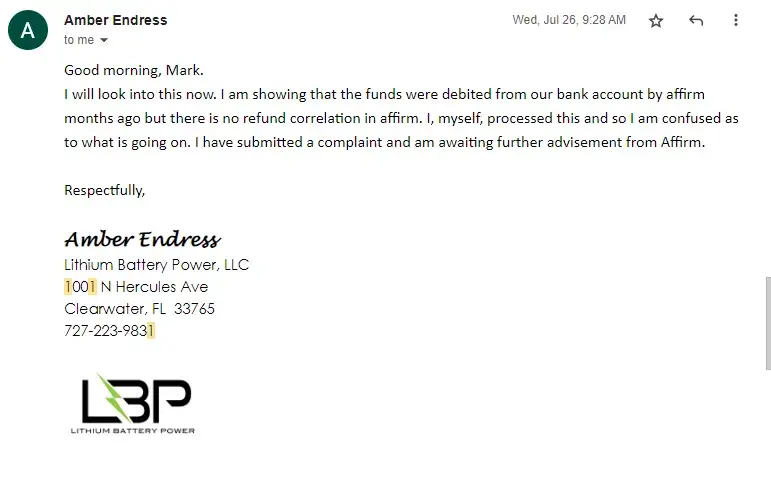 11/15/23 Purchased Lithium Battery $5,000.00 for Golf Cart... Trouble Shoot/Returned in December for Different Voltage/AmpHour in Effort to Correct Problem. More Trouble shooting in January/February determined Battery not Compatible with EZGO RXV and Sent Back for Testing/Refund. Affirm debit's Lithium Account for return in April. In the mean time I am...