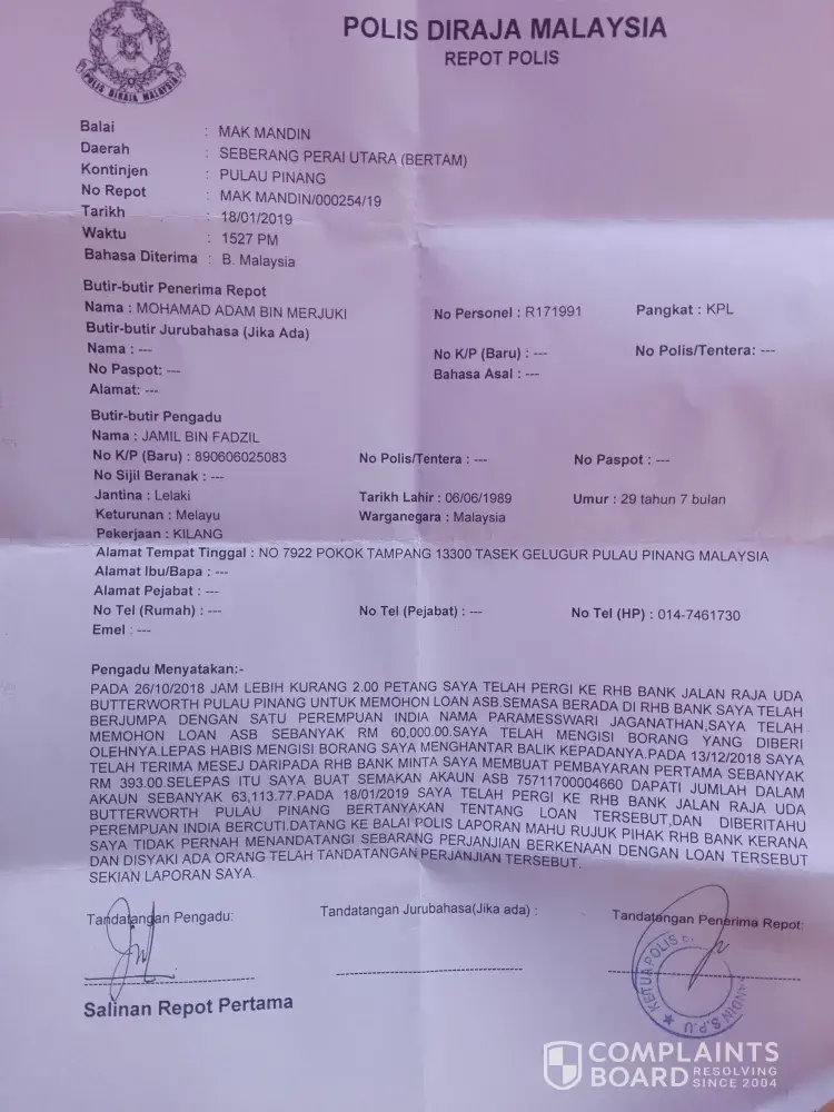 Read full complaintRhB Bank Berhad Raja Uda Butterworth - asb loan rm 60.000