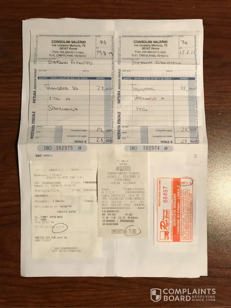 I am requesting refund for the transportation expenses (taxi) to move around while i was waiting for the replacement car; refund of train/bus ticket to pick up the replacement car at Roma Stazione Termini (2 hours away from Sperlonca) . Refund day period of time without the car, from the rental charge .
