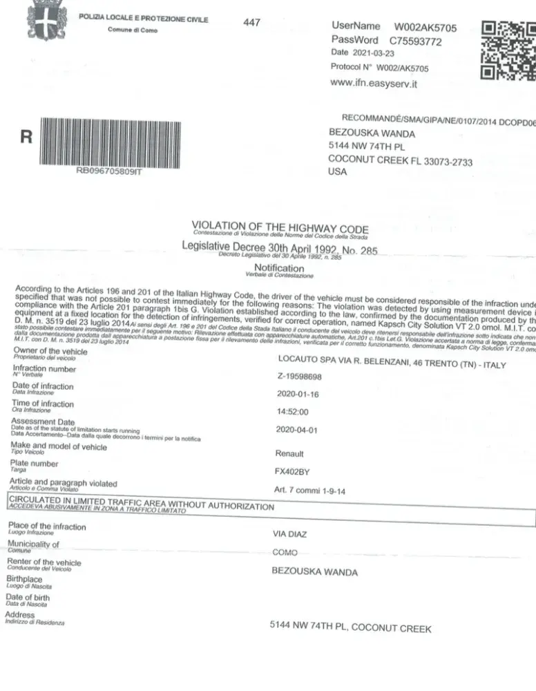 Rental January 2020 (Jan 16 2020 @14:52 traffic violation, Como Italy) Renault license plate FX402BY. The fine of $45.64 was paid to Locate on November 2, 2020 through a Bank of America credit card. I am now receiving notification from Como Polizia, for three times the amount. Can I get help help solving this problem?