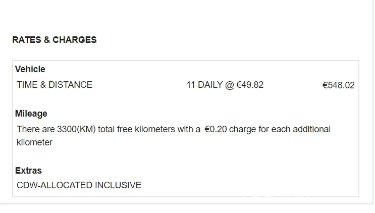 A few days later we had the wonderful surprise on our account that we were debited of 139, 06 euros without any proof nor correspondence. After many phone calls and letters thru our travel agency we finally (5 months later) received a photo (without a date) of a slightly damaged rim on one of the front wheels.!
