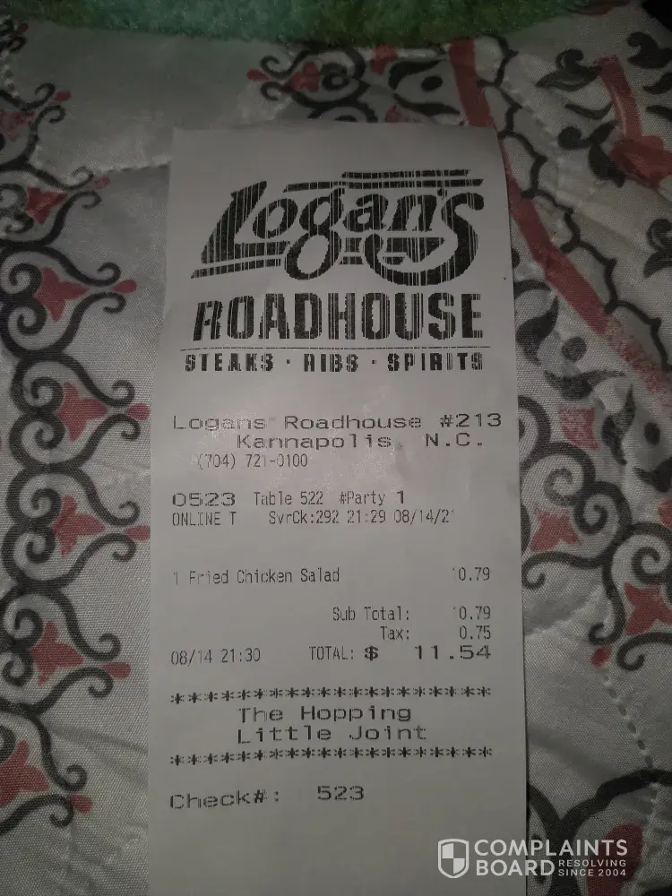 We went to Logan's Roadhouse on Saturday, August 14th, 2021. We waited about an extra 30 minutes in the curbside parking area from the time we were told the order would be ready. We kept our parking lights on so they would know that a customer was there. No one even had the common courtesy or decency to at least come outside and say we apologize for your...