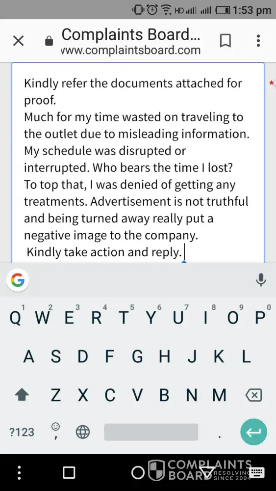 Much time wasted due to misleading information on the advertisement. I had to travel to the outlet for clarification. I was denied of getting any treatments. I lost a lot of time. Who bears the cost of the time wasted?