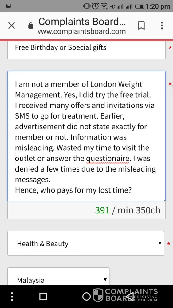 Date : 13 Dec 2016, Sunday. Venue : London Weight Management, De Garden Ipoh Attended By : Miss Mandy. Action : Exercising on Consumer Rights, ^Cooling-off-period. Decision = Refund, ( a sincere refund on the balanced amount). Paid amount :- RM 4750.00 = (10X slimming programme). Incident ( the happening) = :- My lady friend and I paid a visit to the above venue. Was attracted by the adv RM 28 slimming trial. Persuaded into signing a package which my spouse disagrees . Knowing my husband's nature, so I was just interested to take a minimum package of 5X slimming sessions, I thought to myself if the result is prominent, he would be happy to allow me to continue with another more sessions. At the same time, a friend of mine signed for 5X package a month earlier than I, so behind my mind, I was sure that they have such a package. So, I was being turned down, but only a choice of 10X package was available. Feeling rather unhappy that I was being forced into spending an amount that I am not ready for and to face the music when got home. Immediately the next day, exercising on the ^cooling-off-period, he requested me to stop payment through the bank, and this had been made known to the LWM, but no much effect has been promised, nothing positive had been given as well, and so we are not happy to this service. His request is simple, start off with a 5X package for the beginning. -refund the balanced amount [which is not in the use], -he wanted to see a sincere dealing, -seeing his money worth, -see his money back as well, - the over draft amount is refunded. - yes, an immediate action on the decision is a *Refund. Appreciate for a speedy action on this matter. Thank you, Ms. Chong. Decision : Refund.