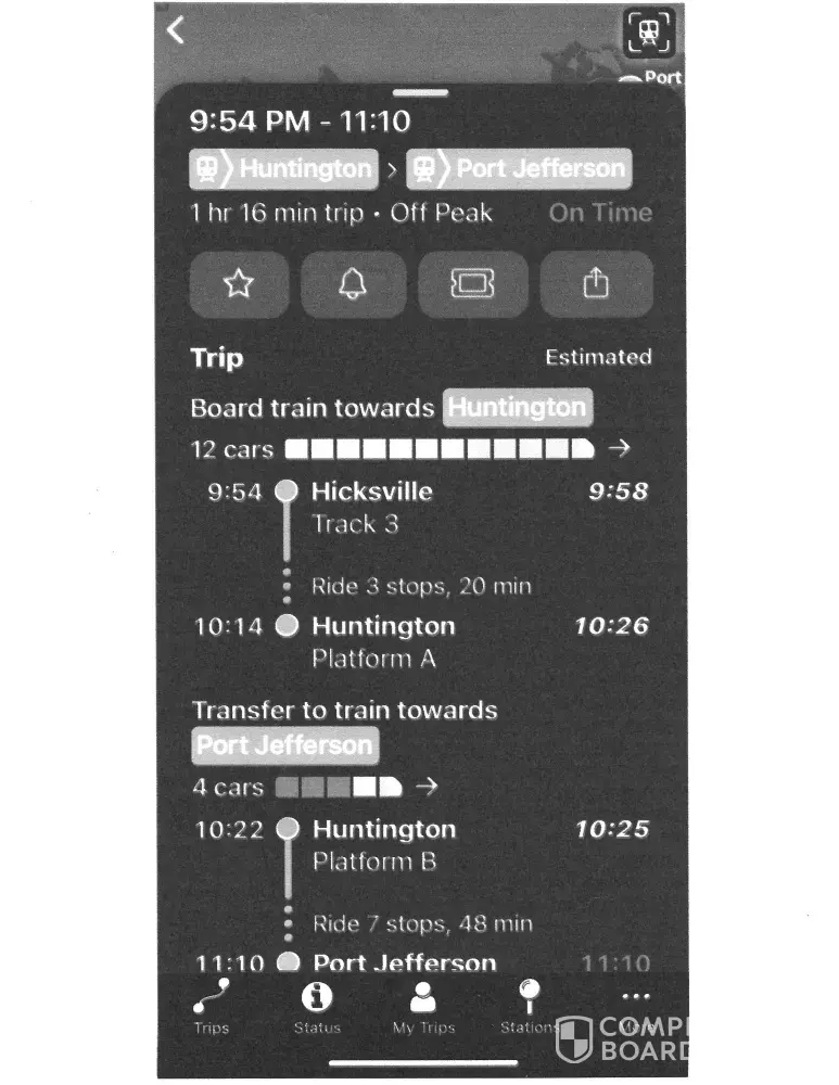 On August 8, 2021 the LIRR schedule to Huntington to Port Jefferson Station were not right. There were a early train from Huntington that's not on the app, it came about 9:25pm, I was waiting for the 9:54pm so I took it. Now I have to wait for the Port Jefferson train at Huntington. That train suppose to come at 10:22pm. So I wait at the platform so I wouldn't be late. The monitor said it was due to arrive. No train came, I wait maybe its delay because it was raining. 11:00pm no train so I take Uber because there is no other way to get to Port Jefferson to get me car.
