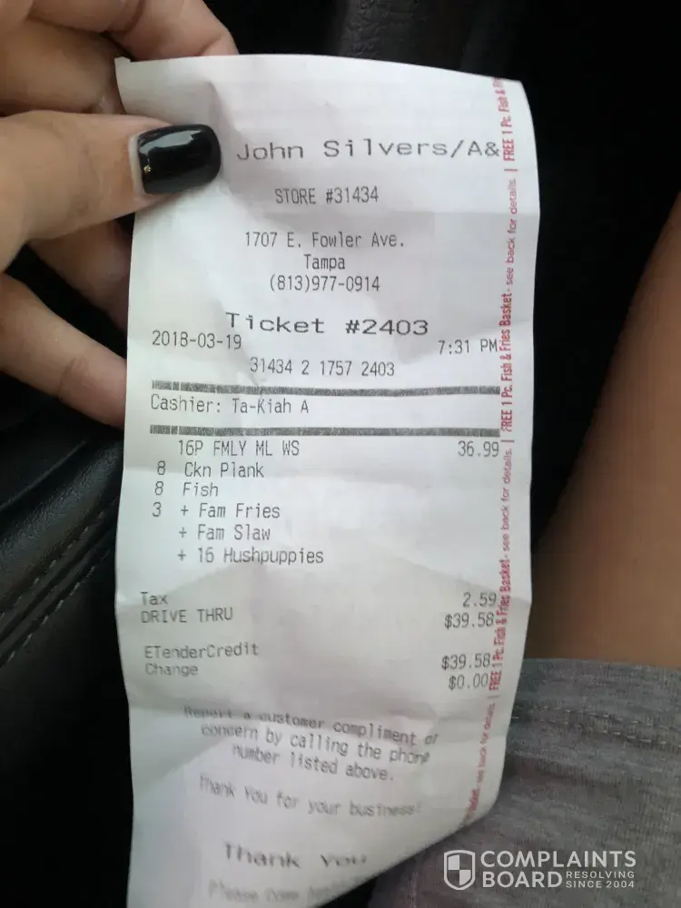 Well if you did tell them about the fish did they make your new one that's why I would had they do cuz sometimes when they're cooking the grease they don't look at everything when they bring it up cuz they think it's automatic cooked fully it's not so I tell people anytime customers get any kind of food check it before you eat it this way if it's not right you shouldn't have to do that nowadays it's different back in the 60s and 70s and 80s when I worked at Wendy's for 25 years for 20 years customers are first at all times nowadays customers are lost sometimes waiting Floyds think now to me has a manager customers right to certain point customer is not right all of the time.
