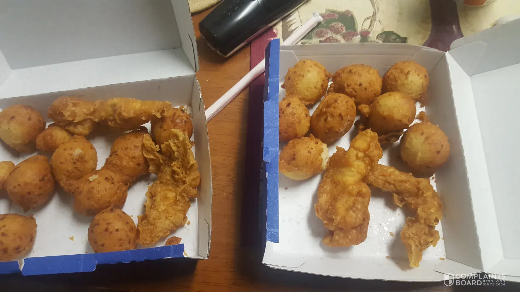 I ordered two 2-piece chicken/ 2 boxes of crumbs + 2 extra chicken. This always comes with fries and a hush puppy. My order consisted of one box with 6 pieces of chicken that was soggy and not at all like long john silvers chicken always has been. There were no fries or anything else. Just chicken and crumbs.