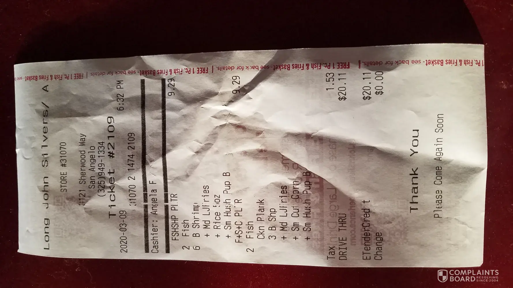 We went to Long John Silver's on March 9th, 2020 at 6:32 PM. Ticket number 2109. We had ordered a number 10 that comes with two fish and six shrimp with rice and hushpuppies and fries, along with a number 11 that comes with two fish, a chicken Plank and 3 shrimp, corn, hush puppies and Fries. I even confirmed with the cashier that the number 10 and number...