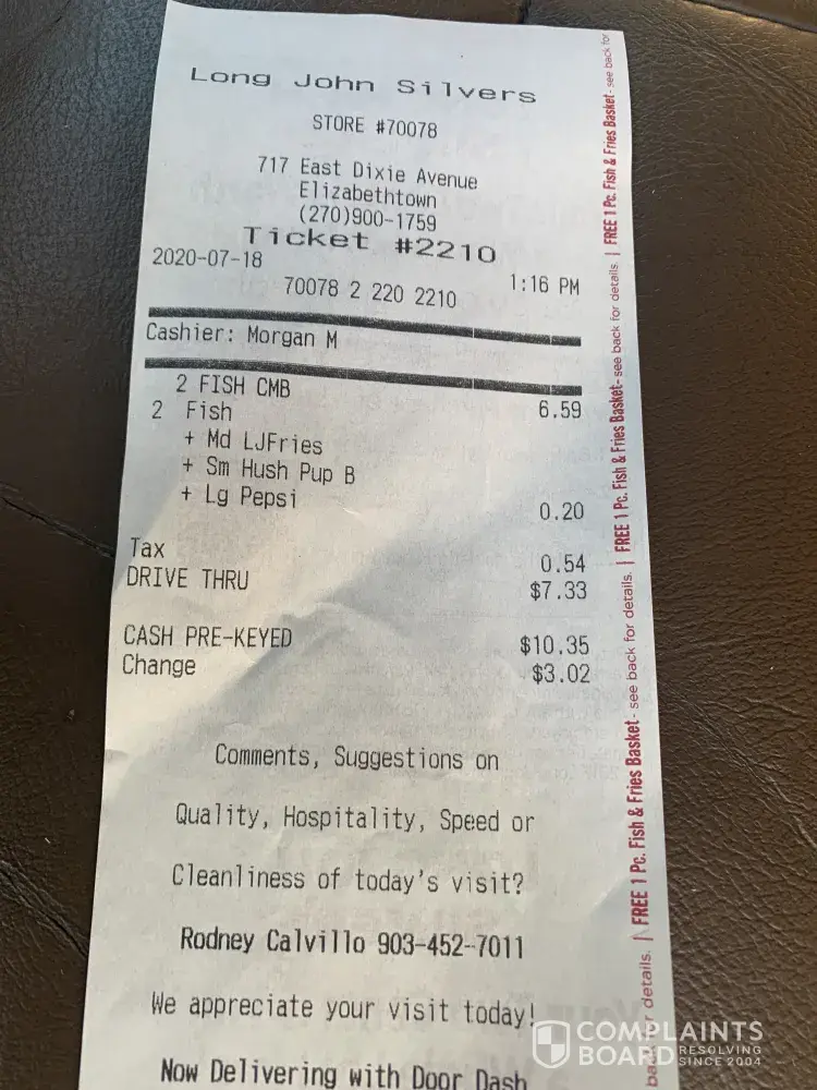 Read full complaintPicked up food on the way to work. Go to work to earn it and the fish was not done.