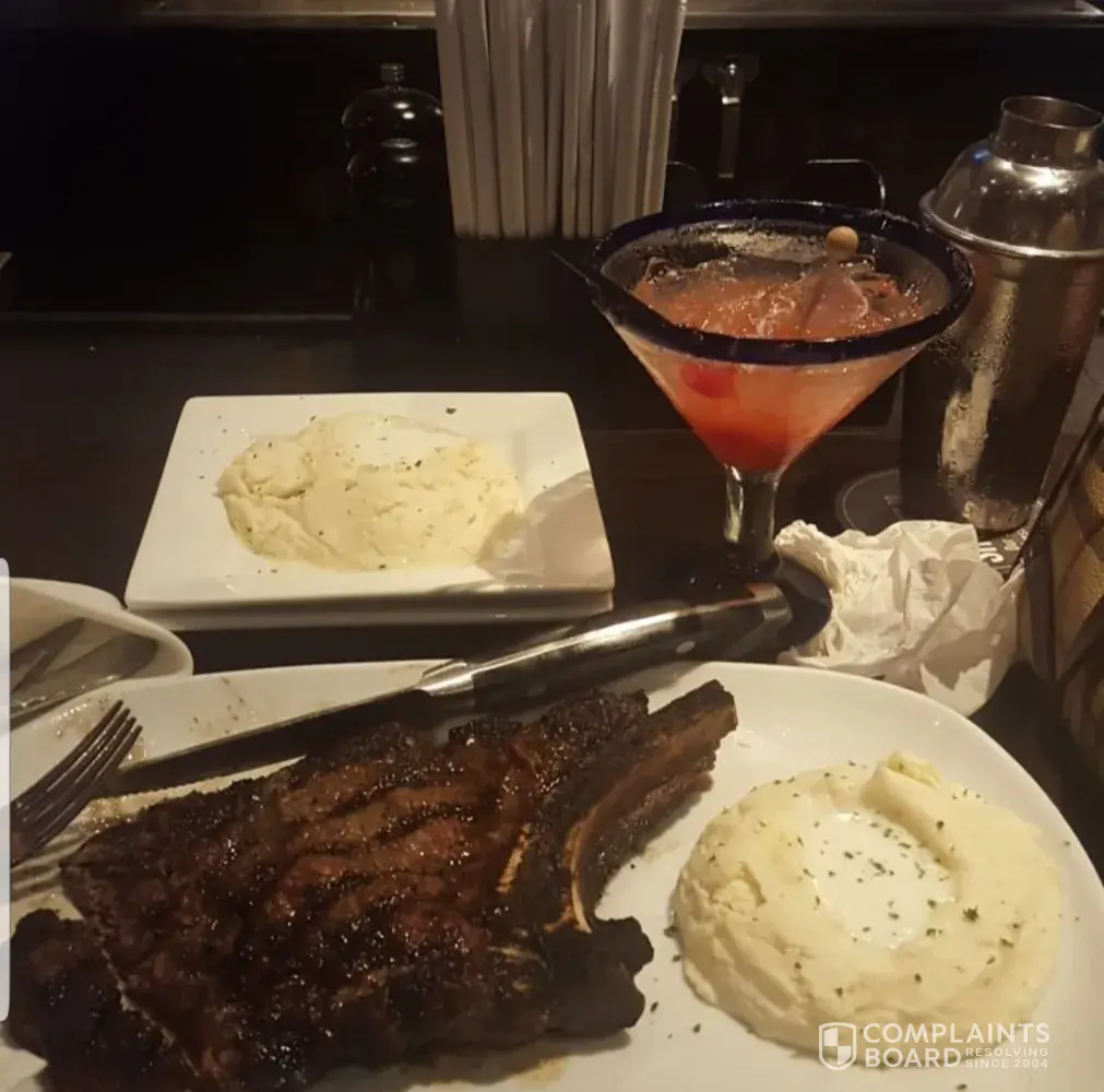 We had a large party of 9 people eat dinner for a special occasion on 8/26/18. My husband and I ordered drinks from the bar to start off. When our drinks arrived they both tasted very very watered down. My drink was supposed to be a cosmopolitan and it tasted like pink tinged water. My husband ordered a Long Island iced tea and his also tasted like water! I told the waitress and my husband agreed to get the same drink again and I told the waitress I didn't want another drink. She was insistent that that she could order me a lemon drop martini and that I'd like it. I reluctantly agreed to try it. In the meantime I ordered a steak dinner cooked medium and it arrived but was dry and well well done! I had to send it back. Both drinks came and my husband said his was a little better and he would drink it. My drink was disgusting. Very very bitter! The waitress took so long to come back with my steak that the whole party finished their meal. She brought us the check and I told her about the lemon drop martini being so bitter and gross that i couldn't drink it and she said she wished I had told her earlier because she had already printed my check! She did not offer to take the drink off the bill nor did she offer to send over the manager. I am extremely disappointed with the quality of the drinks, the meal and the service!