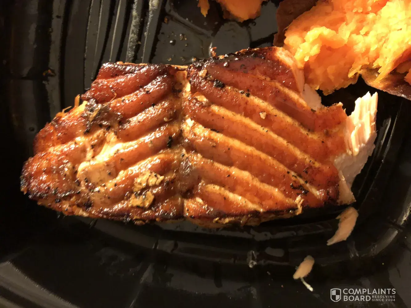 When I received my to go order the salmon was burnt & dry! My sweet potato was dry. I called manager ask if I would return for new order. I WORKED A LONG 10 hour day. Sure I will go I'm still hungry! Manager forgot my order but I didn't have to wait long for second order. Sweet potato still dry/hard. I asked for broccoli. Salmon looked good but when I get back to my hotel (15 minutes later) the salmon is over cooked and crunchy.