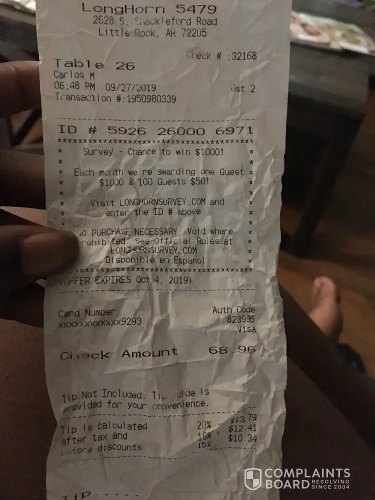 This was my first time visiting this Longhorn... The restaurant wasn't that crowded my server act like he was sooo busy I had to keep asking for items I needed he never asked was I ok or needed anything. I always order the porkchops one of them was great but the other one was dry..I ask one of the waiters for a manager and no one never came. when my waiter...