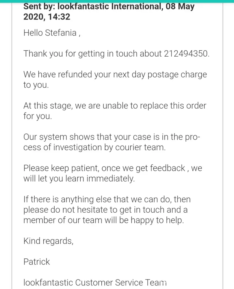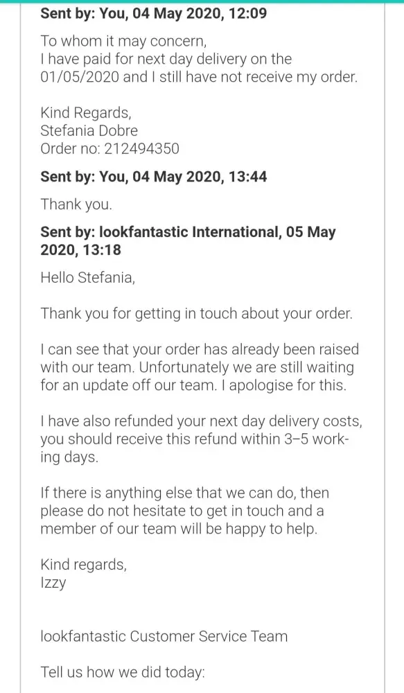 I have ordered a couple of things from LookFantatsic almost 3 weeks ago and I paid for next day delivery. They dispatched the goods and the courier company sent me a tracking link the day after I placed the order. Now 3 weeks later and after so many emails and texts with them, I am yet to receive any real updates or money back for the delivery charges.