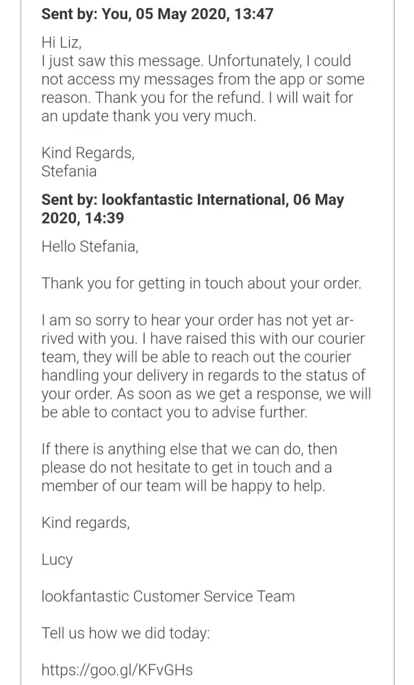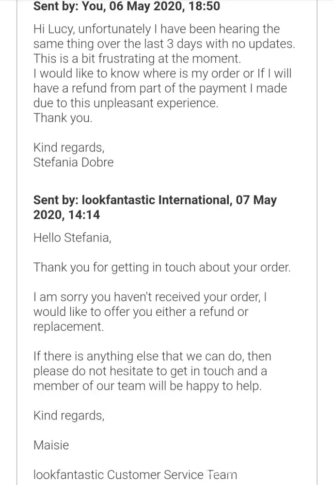 please ask lookfantastic team to either provide me with a refund or solve my problem if they can. I no longer want to deal with these issues and no longer want to keep in contact with this company.