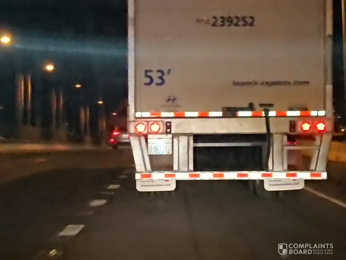 I was in the right lane on the Marcum bridge towards Saint John's. Your driver pulled next to me when it merged to one lane on the freeway. He forced me to slam on my brakes narrowly avoiding being crushed under his 18 wheeler. He could clearly see my vehicle and accelerated in order to cut me off. I observed him flick a lit cigarette or possibly a joint out his window. I think you should drug test this individual and retrain him on the proper procedure for merging while on a narrow bridge on a highway. If I hadn't reacted as quickly as I did my vehicle would have been crushed and I could have easily lost my life. This is very serious. I took photos of his truck and will attach them if possible. His trailer number was 239252 & his plate number was B386101