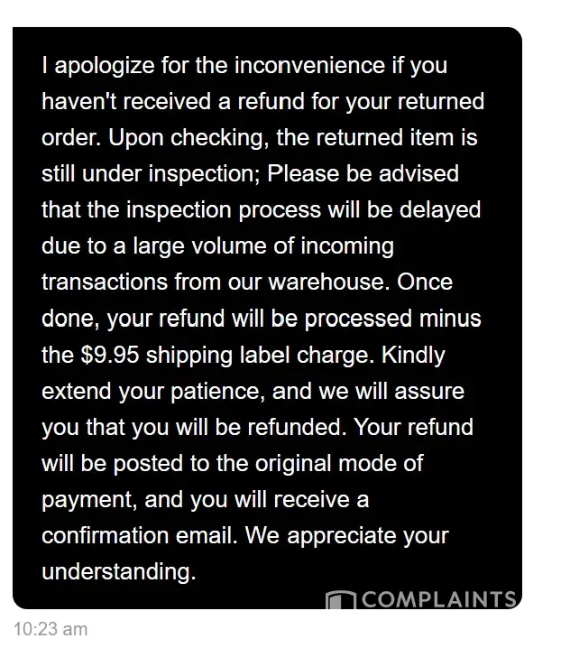Sept 4, 2023 - Order #[protected] - I cannot leave a low enough review because you don’t allow for zero stars. My item was returned and delivered to the warehouse on August 10. I still have not received a refund. I have contacted the company several times and not only to have they not provided a refund.l, they proceeded to address me by a different name than my own. When questioned on that matter, they continue to call me by a different name. I will warn people from purchasing from this company, and I will not be purchasing anything from this company again. They are not following their return policy and seemed content with holding onto my money.