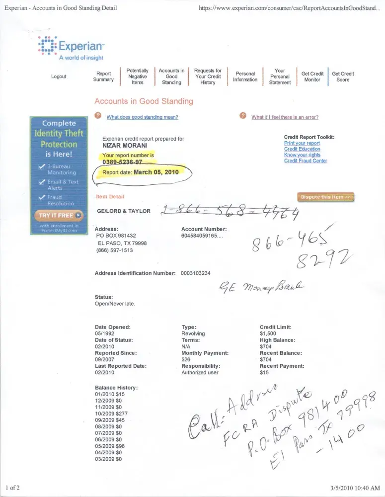 On checking my Credit Report at Experian on 3/5/2010, I was surprised to find an account attached to me. This account is regarding Credit Card from GE/Lord & Taylor. I do not have any such account or any account at Lord & Taylor. This report shows that the card is regularly being used and monthly payments are being made by some other person. I have been trying to contact GE/Lord & Taylor with no clear response. I am just being told repeatedly that they cannot help me and that I have to file a written complaint by snail mail and then maybe they might decide to clear up the matter. Attached is a copy of the said account at Experian on my Credit Report. I hope someone at the GE credit card company looks into the matter and rectify their reporting to the Credit Bureaus.