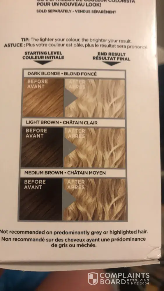 I received a defective product and would like a refund, or at least a coupon to buy another L'Oréal product. My hair barely changed at all, and I followed the instructions to the dot. Left on 60 minutes total, 60 on hair, 30 on roots. Attached before and after pictures. I dye my hair all of the time, I assure you I applied it evenly, but it barely changed. I'm very disappointed with the lack of lightening.