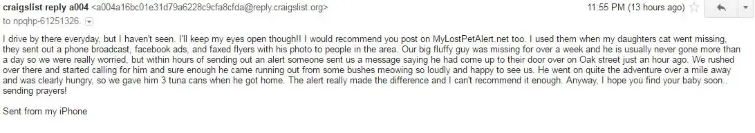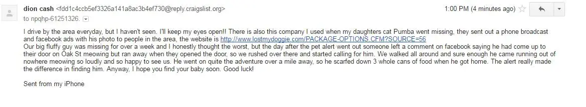 I received two emails from people claiming to have used the 'lostmydoggie.com' website. The emails were from different people, but the text was 99% the same! This website is clearly a scam. They are paying people to respond to craigslist lost pet postings and try to lure them into using their website.