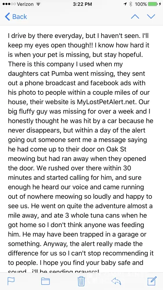Our free fax and email service is meant to help get the word out, but it cannot replace all the hard work it takes to physically get out there and look for your pet. It is especially important to go in person to all shelters in your county, and to look at the photos of animals in their sick/injured area, as well. Do not rely on their websites or on what someone may tell you on the phone. There are too many people working at the shelters for each person to know everything about every animal that comes in. You must go in person every day or two to look for yourself. It is painstaking and difficult work, but your diligence will be worth it.
