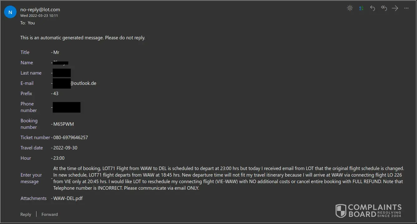 My email [protected]@hotmail.com. I could not send any information through passenger's form on LOT website, and lack of any email directly to the case specialist.