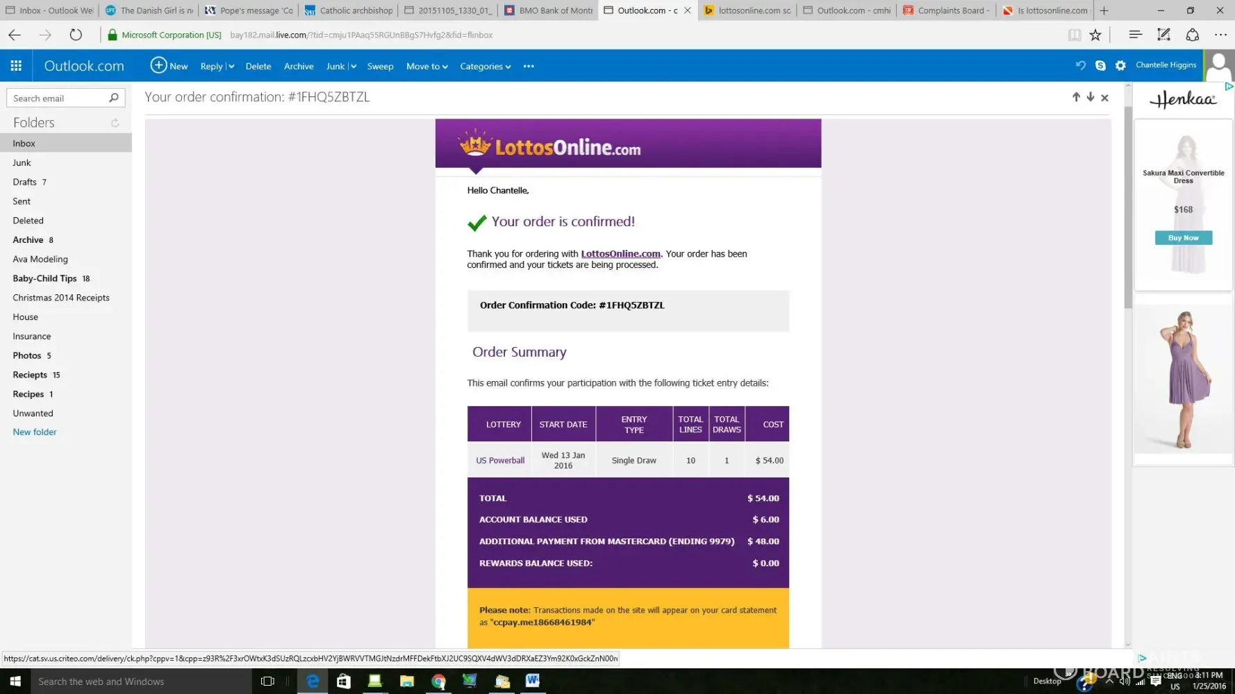 On january 9th & 12th, respectively, I purchased tickets for the us powerball lottery draw. Unfortunately, I didn't win, however as I was going over my mastercard statement today, I noticed something odd. For my 54.00 order on january 9th (Order confirmation #1fhbzo6pr4) I was charged 78.39 and for my 48.00 order on january 12th (Order confirmation #1fhq5zbtzl) I was charged 70.33, which is 46.72 more than I was expecting. After a great deal of searching on your site, I discovered that the site is based in cyprus & then understood that I was charged british pounds. My anger is that in the top right corner of the website is a small canadian flag next to the word "english", which I generally understand to mean i'm on the canadian version of a website. Nowhere on your site is there any mention of the currency that the customer will be charged in - with the current state of the canadian dollar, I never would have ordered anything had I been aware that I wasn't being charged in canadian dollars. I think it is very underhanded to make no mention of what currency is being charged & allowing people to think they are making a purchase in one currency when it is really in another. I would like the $46.72 cdn refunded to my credit card.