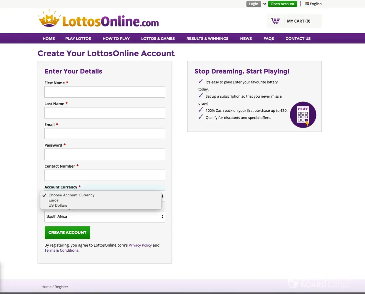 When a player signs up and registers their account on LottosOnline, they need to choose their preferred currency, either US Dollars or Euros and that currency and pricing is reflected throughout the site when are logged in and purchasing. A screenshot of our create/register account page showing the account currency selection option is attached.