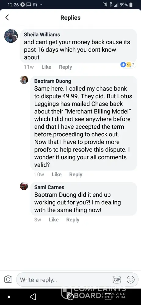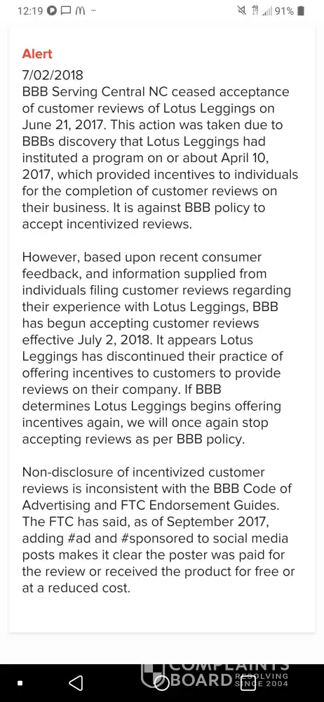 This company also has hundreds of complaints lodged against them that the BBB has been investigating, as well as hundreds of others that started a FB page devoted to educating others to not buy Lotus Leggings. This has been a ongoing problem.