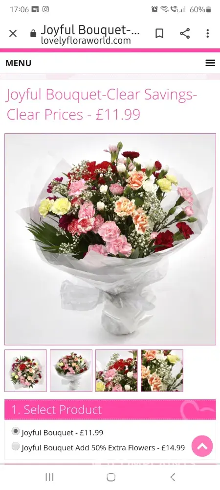 I ordered which I thought was a beautiful bunch of flowers, I paid extra for a extra 50% off flowers, when they arrived they box was lovely (the only thing that was nice) opened box to a very small bunch flowers which I can actually buy for a few pound at supermarket, I immediately contacted this company to say wasn't happy etc send photos as nothing like ones I ordered was no foliage etc lillies were falling off stems, Betty the girl that took my call told me flowers were acceptable as the 50% extra were included in this bunch 14/15 stems I received apparently you get a extra 16 stems with the extra 50% which I certainly did not, would not refund me told me post office would happily return to sender at no cost for me then I would receive my refund, off I go to the post office with box and dying now flowers to be told £6.80 it would cost me, they can only send free if there's a return label, rang again no answer this time, rang this morning again spoke to Betty oh after I'd withheld my number as she wouldn't answer my calls to tell her what the post office had said, again fobbed off I now want to speak to the manager who suprise suprise is not there till next week where the flowers will then be well and truly wilted, I've tried emailing the CEO of the company but again email not in use, this company is ripping people off I'm so angry at being fobbed off again and now going contact trading standards