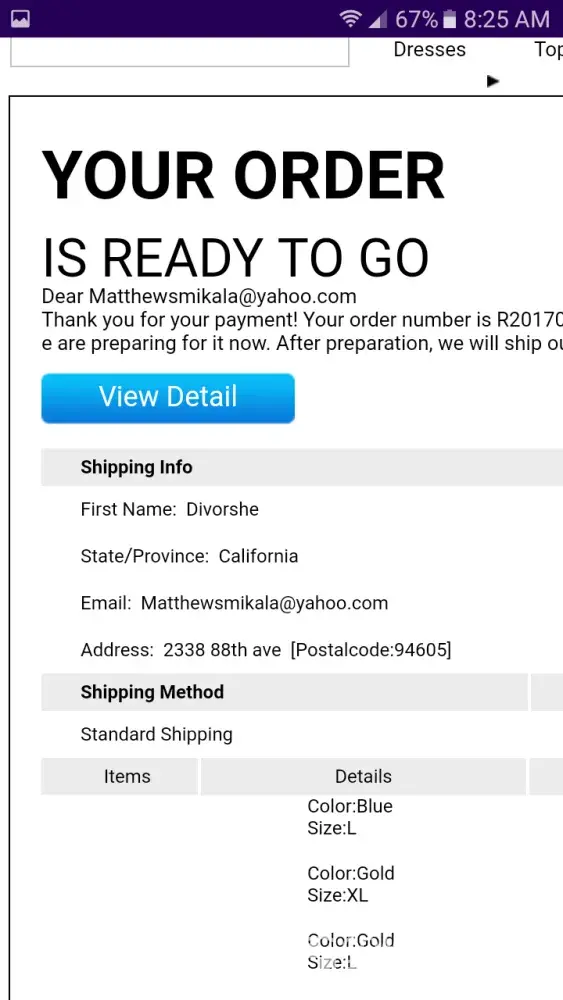 I order a blue jean mini dress at the beginning of April along with a dress for the last week or so I've been trying to contact lovelywholesale with no luck no response so I'm in and out of my account weekly I haven't received any items yet and that why I check my account weekly so many days out the other other the dress is black no problem with it just the blue jean mini dress .This week I went to check and I check near the weekend just to see if it my order arrives before I check went to check the week of the 25th of may open my account I see a different dress then the one I ordered now not only am I checking to see why is it taking so long or trying to track I'm trying to contact them about the dress being switched out for another dress that I fine very not liked by me so I been trying contact them by submitting a ticket no luck I've tried live chat I got through once and somehow got disconnected after she told me to !I've chat with her through email and I explained to her I'm not sure how to do that but I did explain to her some of what my problem I'm having. I will keep trying until I get someone or hear from someone by email or I get my package I was trying to stop the delivery before it arrives and resolve the problem either with the correct dress or a refund.The blue jean dress with the tie string around the waist is the one that was originally ordered.