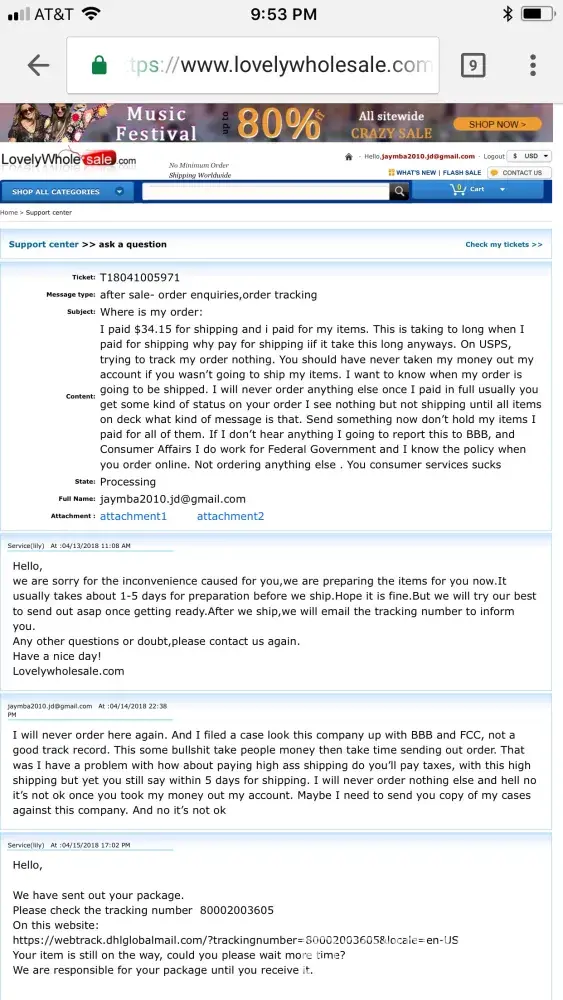 I placed an order on june 1 2018, spent almost $200. After 6 days of hearing nothing I sent a ticket. Well I got a response not to long after in my email box. Could I read the response, of course not. It only told me basically to sign in, and when you do it takes you to tickets but nothing is there for sent tickets. I honestly wish I would have read the reviews on shipping, etc because I would have shopped fashionova. Next clothing hail will definitely not be lovelywholesale... Order #r2018053199000