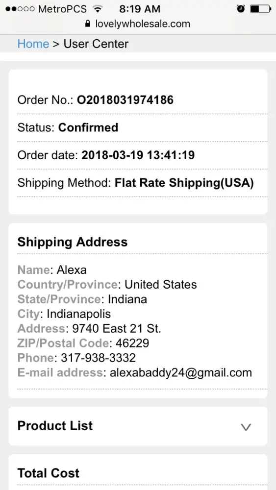 Lovely wholesale don't have a contact number. And I still haven't received my order. My status still say confirmed. The amount went for $18.46 usd to $0.00 usd. And my money isn't on my card.