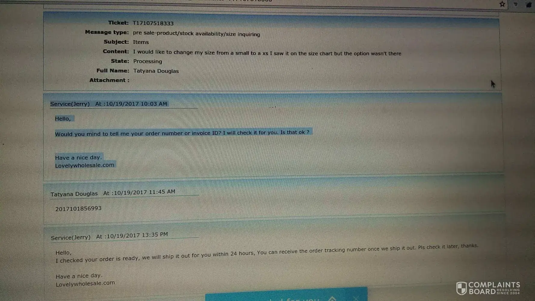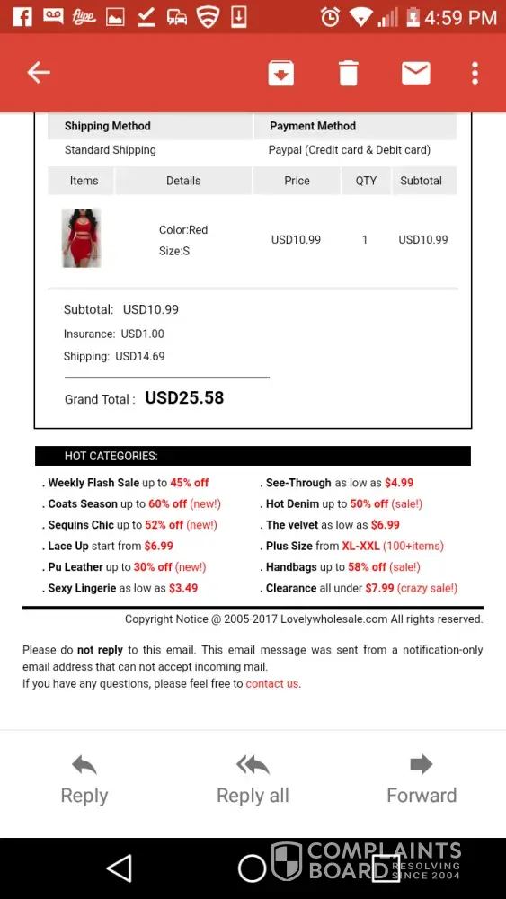 On september 19th I ordered $136.00 worth of clothing. I ordered it through paypal and I still have not received my items yet. I sent a ticket to them along with the scanned order including all of their information from paypal and I received a response asking me to give them the order number. I don't know if it's a lack of understanding of the english language or that they just don't know how to read but a copy of the invoice was included. I am still awaiting a reply after I resent the order number to find out what happened to my order. I am going to ask for a full refund back to my paypal account because I am quite dissatisfied and I will never order or recommend lovelywholesale to anyone!